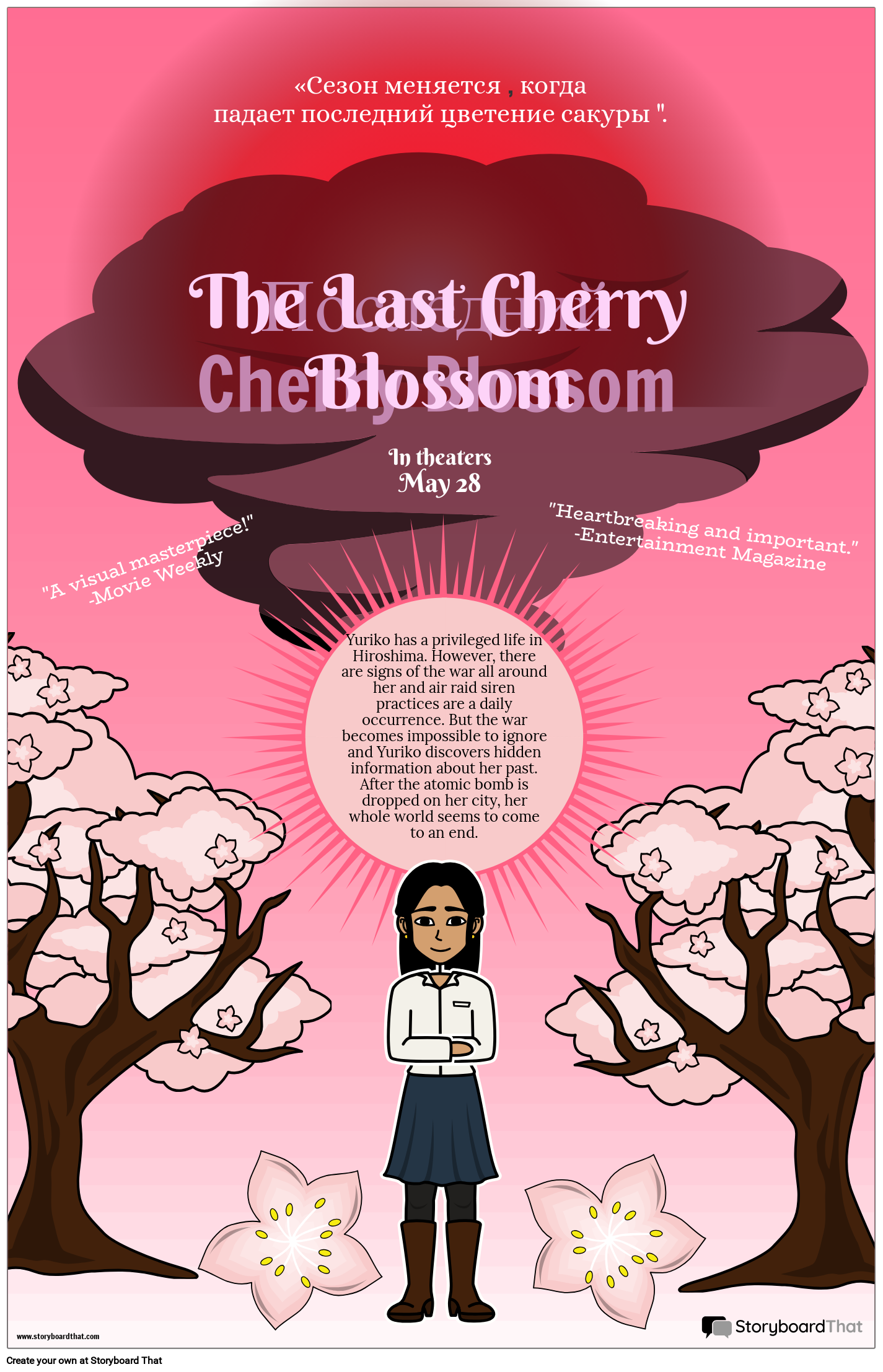 Учащиеся могут создать плакат фильма «Последний цветение вишни» Кэтлин Беркиншоу, выделив ключевые сцены или темы из рассказа.