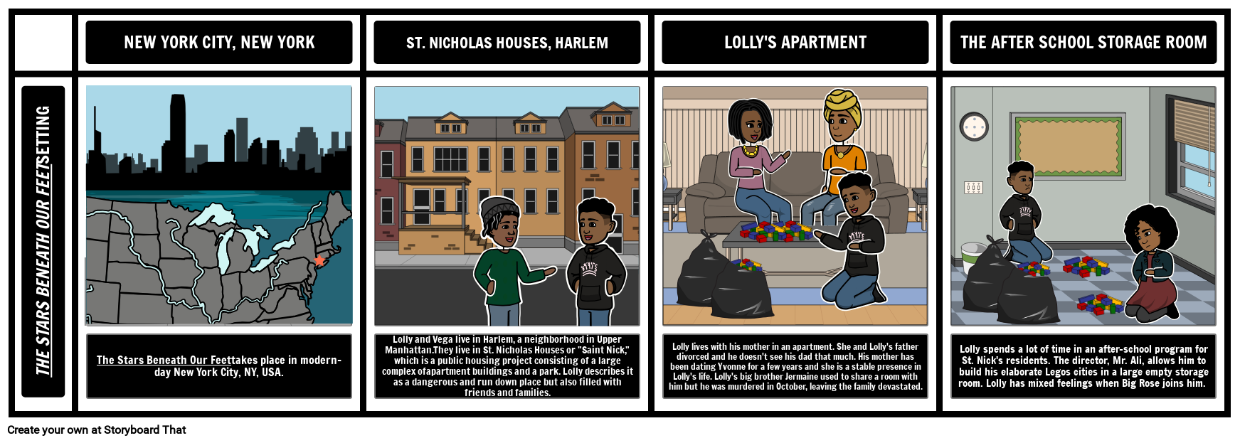 Lolly and Vega live in Harlem, a neighborhood in Upper Manhattan.They live in St. Nicholas Houses or "Saint Nick," which is a public housing project consisting of a large complex ofapartment buildings and a park. Lolly describes it as a dangerous and run down place but also filled with friends and families.