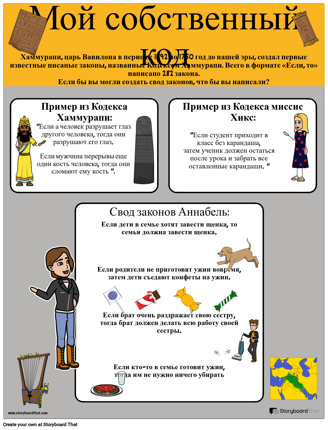 Хаммурапи, царь Вавилона в период с 1792 по 1750 год до нашей эры, создал первые известные писаные законы, названные Кодексом Хаммурапи. Всего в формате «Если, то» написано 282 закона. Если бы вы могли создать свод законов, что бы вы написали?