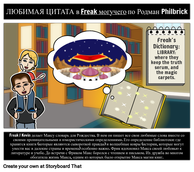 Freak / Kevin делает Максу словарь для Рождества. В нем он пишет все свои любимые слова вместе со своими проницательными и юмористическими определениями. Его определение библиотеки: где хранятся книги (которые являются сывороткой правды) и волшебные ковры (истории, которые могут унести вас в далекие страны и времена) особенно важно. Фрик вдохновил Макса своей любовью к литературе и учебе. До встречи с Фриком Макс боролся с чтением и письмом. Их дружба во многом обогатила жизнь Макса, одним из которых было открытие Макса магии книг.