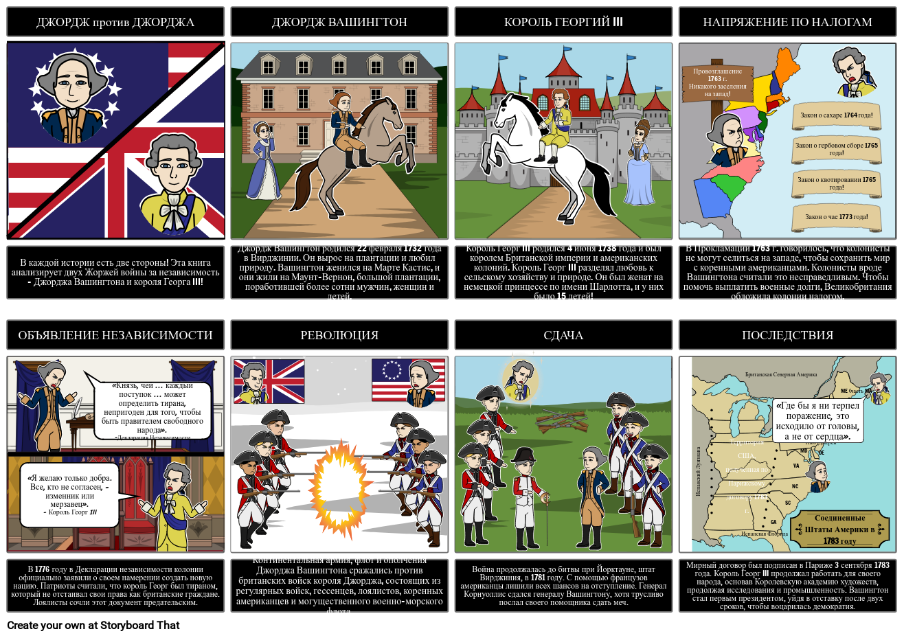 Мирный договор был подписан в Париже 3 сентября 1783 года. Король Георг III продолжал работать для своего народа, основав Королевскую академию художеств, продолжая исследования и промышленность. Вашингтон стал первым президентом, уйдя в отставку после двух сроков, чтобы воцарилась демократия.