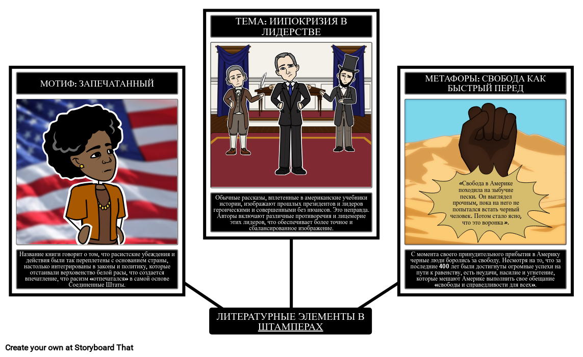 Определите различные литературные элементы: темы, символы, мотивы, образный язык и т. Д., Присутствующие в книге «Штампованные: расизм, антирасизм и вы». Проиллюстрируйте и опишите их, используя доказательства из текста.