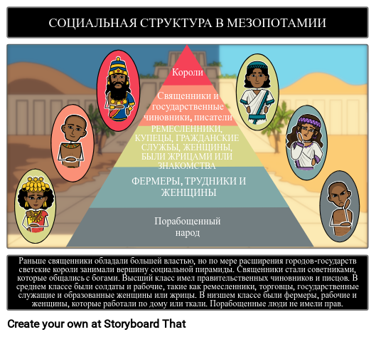 Раньше священники обладали большей властью, но по мере расширения городов-государств светские короли занимали вершину социальной пирамиды. Священники стали советниками, которые общались с богами. Высший класс имел правительственных чиновников и писцов. В среднем классе были солдаты и рабочие, такие как ремесленники, торговцы, государственные служащие и образованные женщины или жрицы. В низшем классе были фермеры, рабочие и женщины, которые работали по дому или ткали. Порабощенные люди не имели прав.