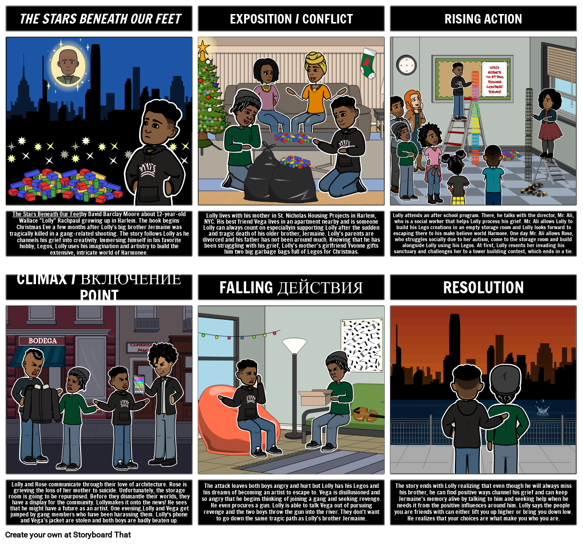 The Stars Beneath Our Feetby David Barclay Moore about 12-year-old Wallace "Lolly" Rachpaul growing up in Harlem. The book begins Christmas Eve a few months after Lolly's big brother Jermaine was tragically killed in a gang-related shooting. The story follows Lolly as he channels his grief into creativity. Immersing himself in his favorite hobby, Legos, Lolly uses his imagination and artistry to build the extensive, intricate world of Harmonee.
