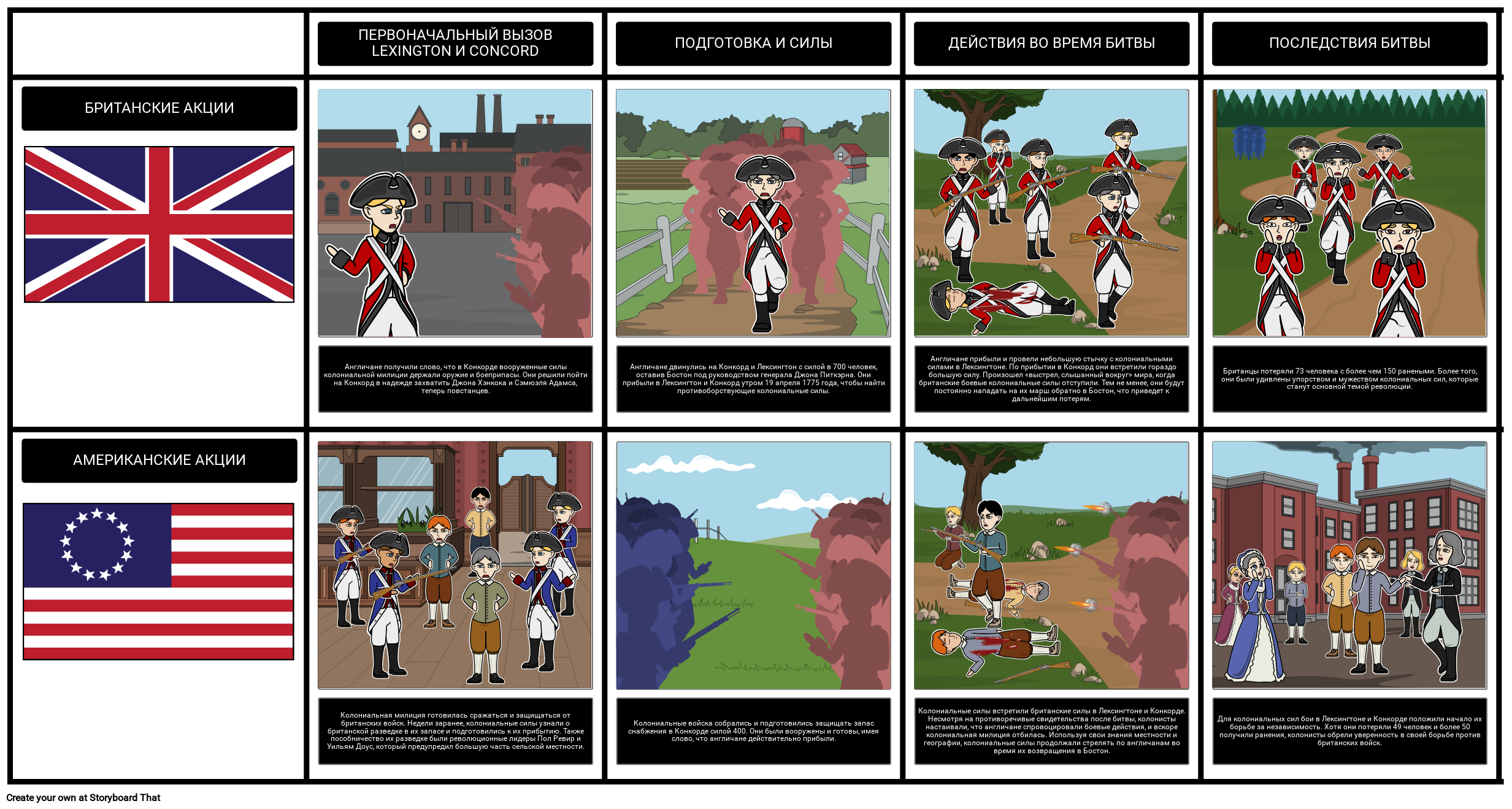 Англичане прибыли и провели небольшую стычку с колониальными силами в Лексингтоне. По прибытии в Конкорд они встретили гораздо большую силу. Произошел «выстрел, слышанный вокруг» мира, когда британские боевые колониальные силы отступили. Тем не менее, они будут постоянно нападать на их марш обратно в Бостон, что приведет к дальнейшим потерям.