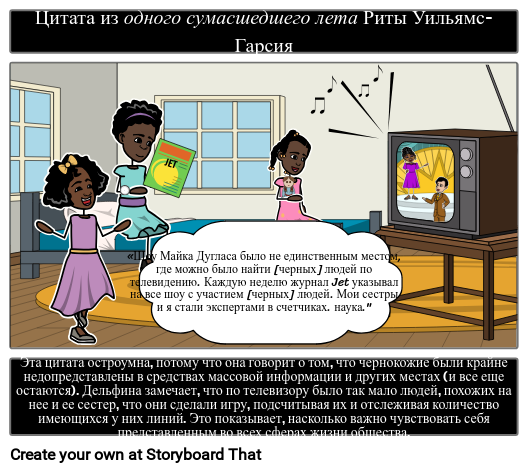 Эта цитата остроумна, потому что она говорит о том, что чернокожие были крайне недопредставлены в средствах массовой информации и других местах (и все еще остаются). Дельфина замечает, что по телевизору было так мало людей, похожих на нее и ее сестер, что они сделали игру, подсчитывая их и отслеживая количество имеющихся у них линий. Это показывает, насколько важно чувствовать себя представленным во всех сферах жизни общества.