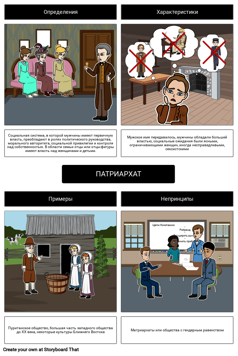 Социальная система, в которой мужчины имеют первичную власть, преобладают в ролях политического руководства, морального авторитета, социальной привилегии и контроля над собственностью. В области семьи отцы или отцы-фигуры имеют власть над женщинами и детьми.