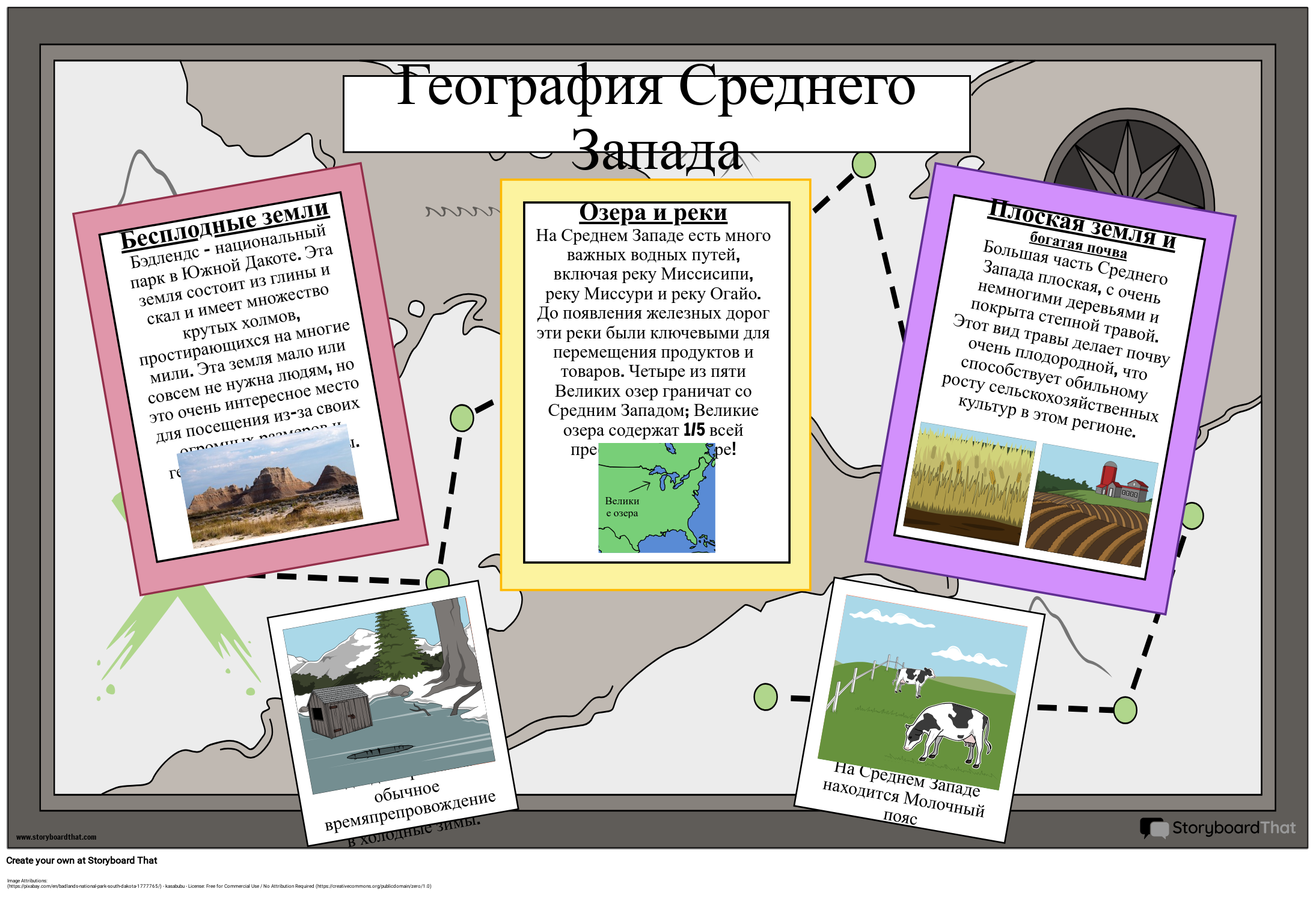 • Плоская земля и богатая почва Большая часть Среднего Запада плоская, с очень немногими деревьями и покрыта степной травой. Этот вид травы делает почву очень плодородной, что способствует обильному росту сельскохозяйственных культур в этом регионе.