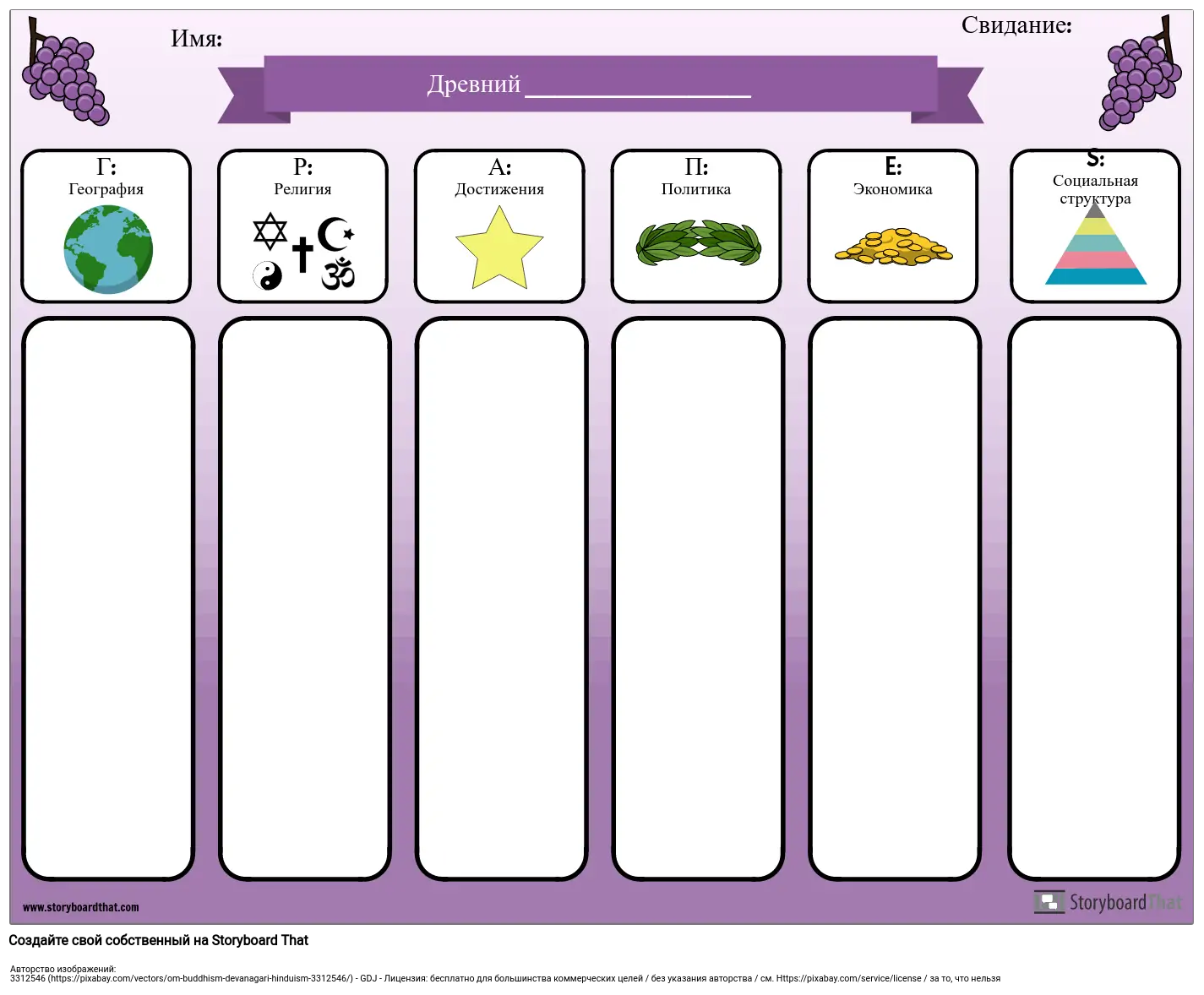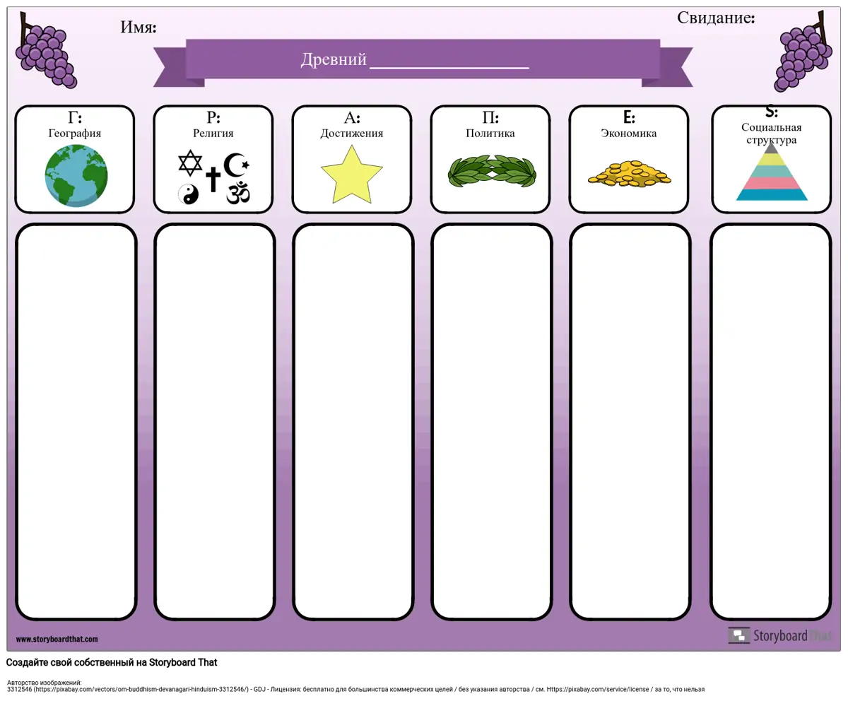 Аббревиатура ВИНОГРАДА - полезный инструмент при изучении древних цивилизаций или разных стран. Используйте эту таблицу ВИНОГРАДА в цифровом виде (попросите учащихся ввести свои заметки и добавить изображения в каждую категорию) или распечатать ее, и учащиеся могут писать свои заметки от руки.