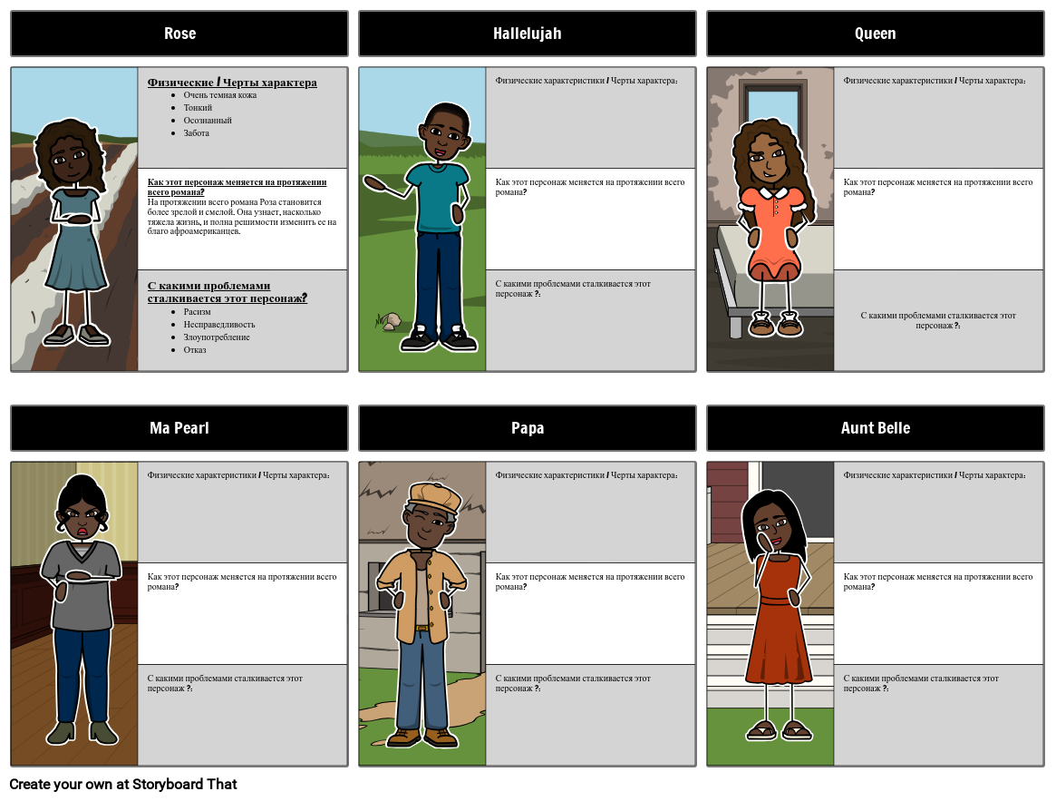 Физические / Черты характера Очень темная кожа Тонкий Осознанный Забота Как этот персонаж меняется на протяжении всего романа? На протяжении всего романа Роза становится более зрелой и смелой. Она узнает, насколько тяжела жизнь, и полна решимости изменить ее на благо афроамериканцев. С какими проблемами сталкивается этот персонаж? Расизм Несправедливость Злоупотребление Отказ
