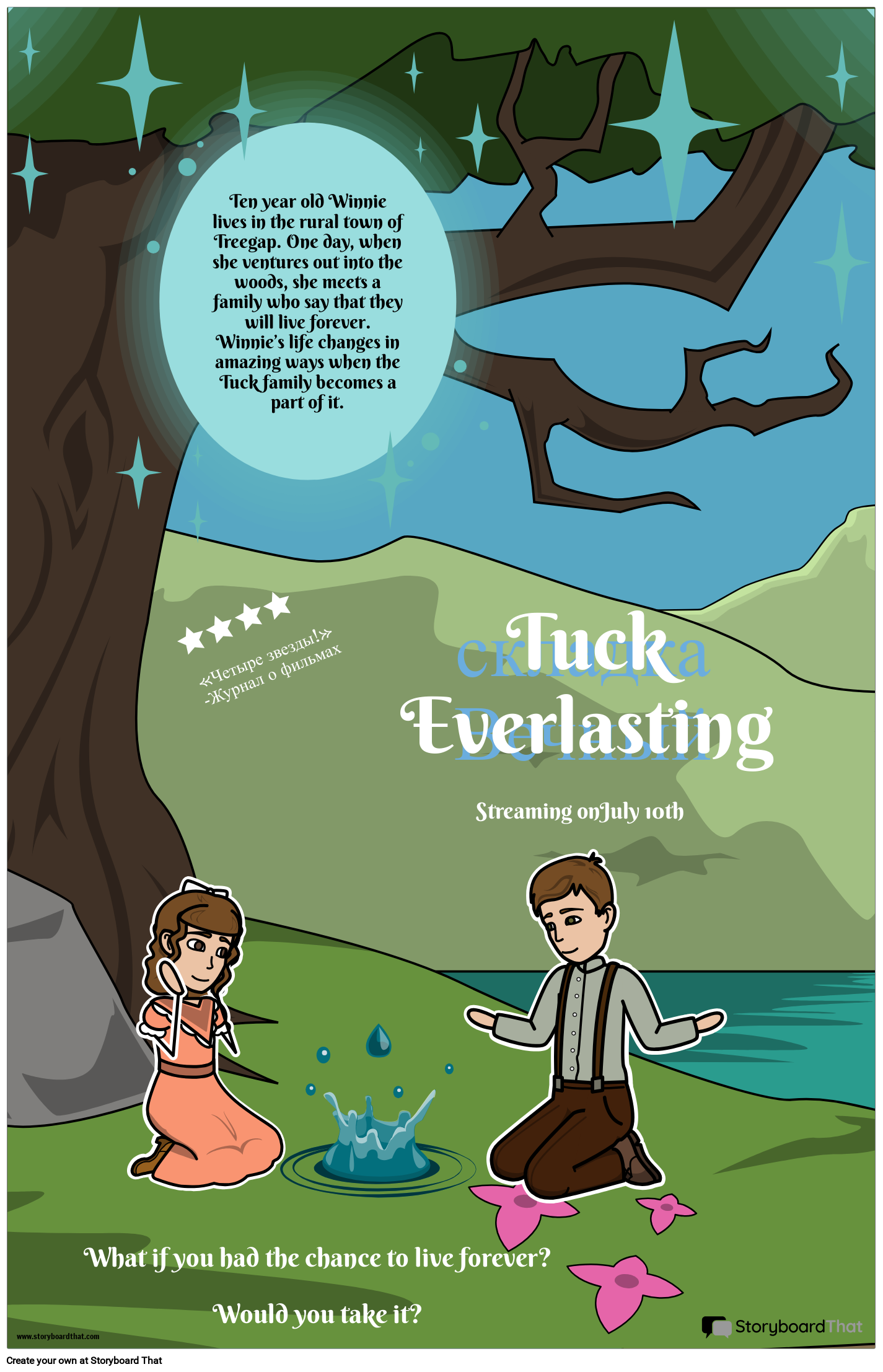 Попросите учащихся создать свой собственный постер фильма «Так вечно» Натали Бэббит. Они могут выделить ключевые темы, персонажей и сцены из книги и включить обзор критиков!
