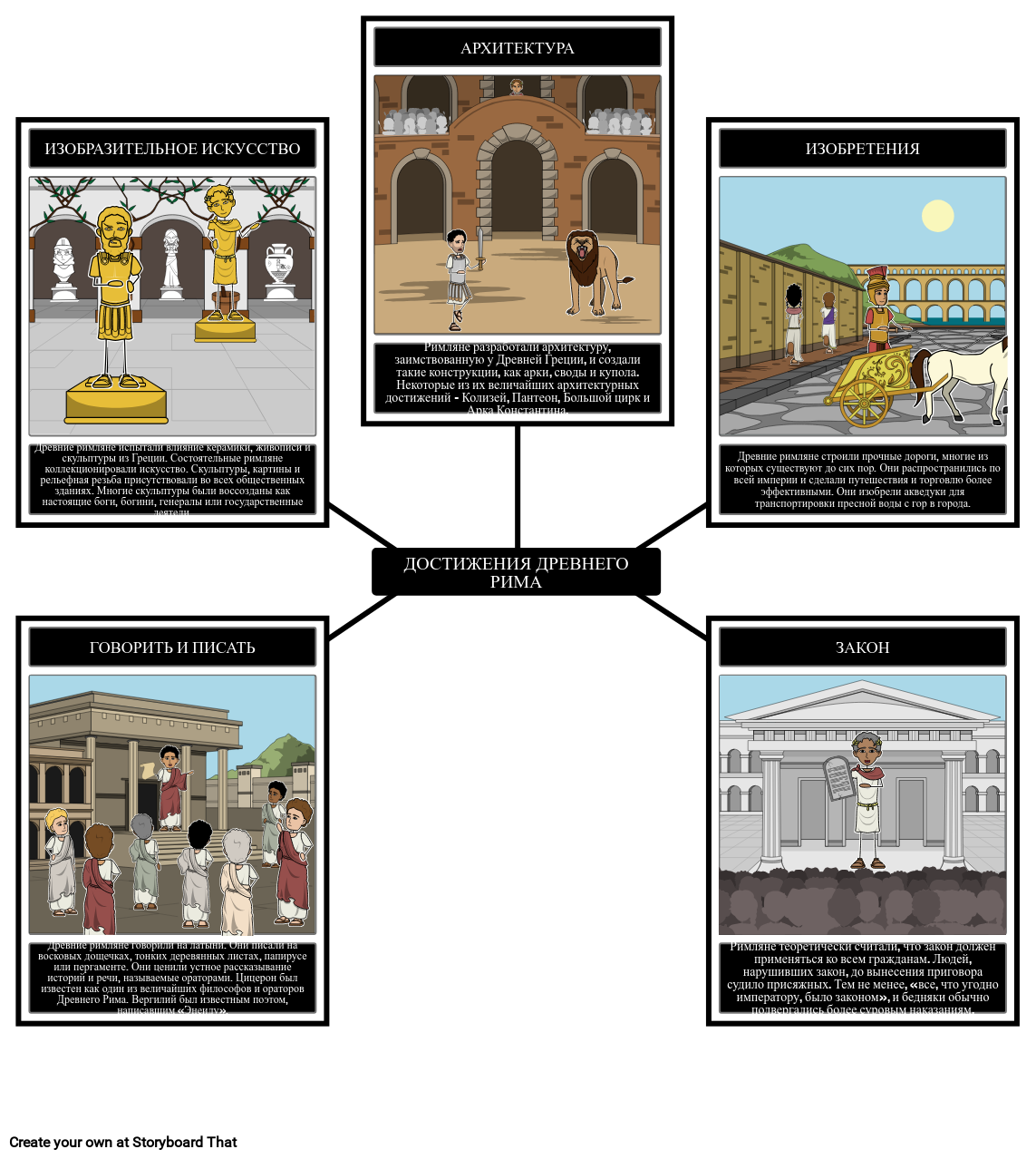 Римляне разработали архитектуру, заимствованную у Древней Греции, и создали такие конструкции, как арки, своды и купола. Некоторые из их величайших архитектурных достижений - Колизей, Пантеон, Большой цирк и Арка Константина.