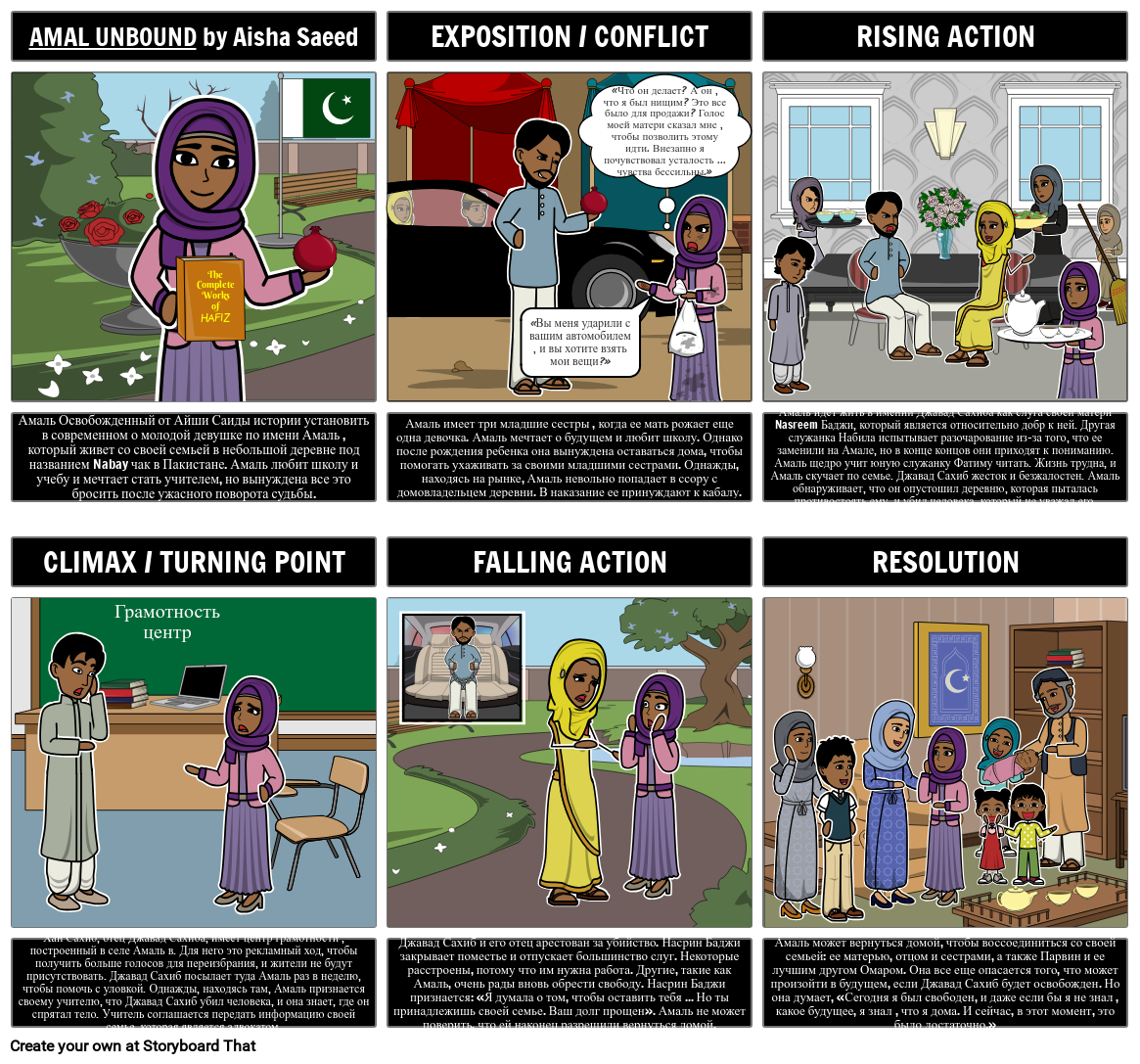 Студенты могут обобщить и проиллюстрировать сюжет истории в раскадровке с 6 ячейками, выделяя экспозицию и конфликт, восходящее действие, кульминационный момент / поворотный момент, падающее действие и разрешение.