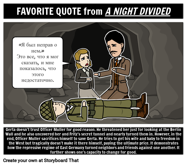 • Gerta doesn't trust Officer Muller for good reason. He threatened her just for looking at the Berlin Wall and he also uncovered her and Fritz's secret tunnel and nearly turned them in. However, in the end, Officer Muller sacrifices himself to save Gerta. He tries to get his wife and baby to freedom in the West but tragically doesn't make it there himself, paying the ultimate price. It demonstrates how the repressive regime of East Germany turned neighbors and friends against one another. It further shows one's capacity to change for good.