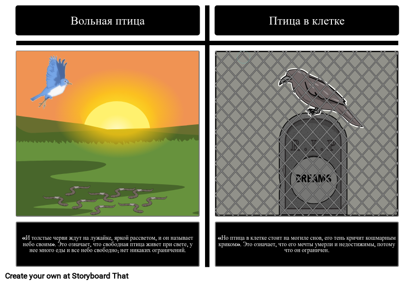 «Но птица в клетке стоит на могиле снов, его тень кричит кошмарным криком». Это означает, что его мечты умерли и недостижимы, потому что он ограничен.