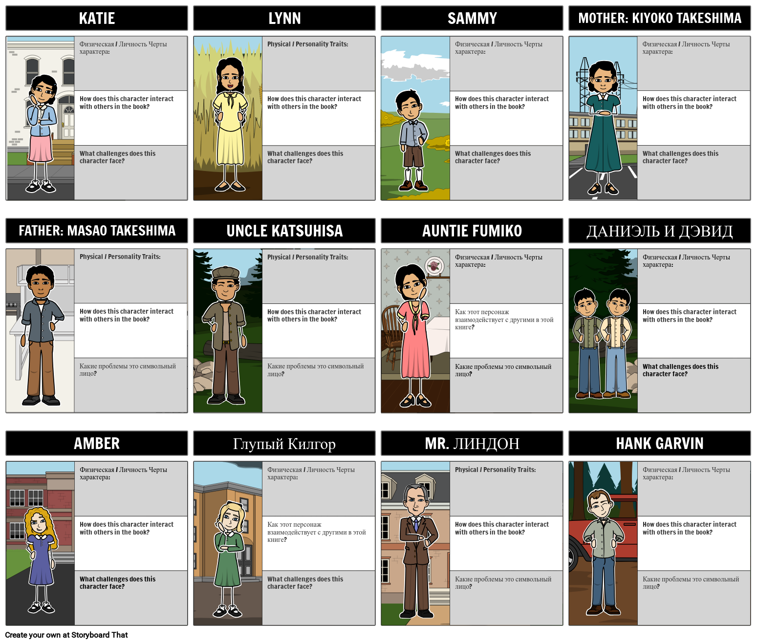 Учащиеся могут нарисовать персонажей книги и написать о физических / личностных качествах каждого персонажа, их взаимодействии с другими людьми и проблемах, с которыми они сталкиваются.