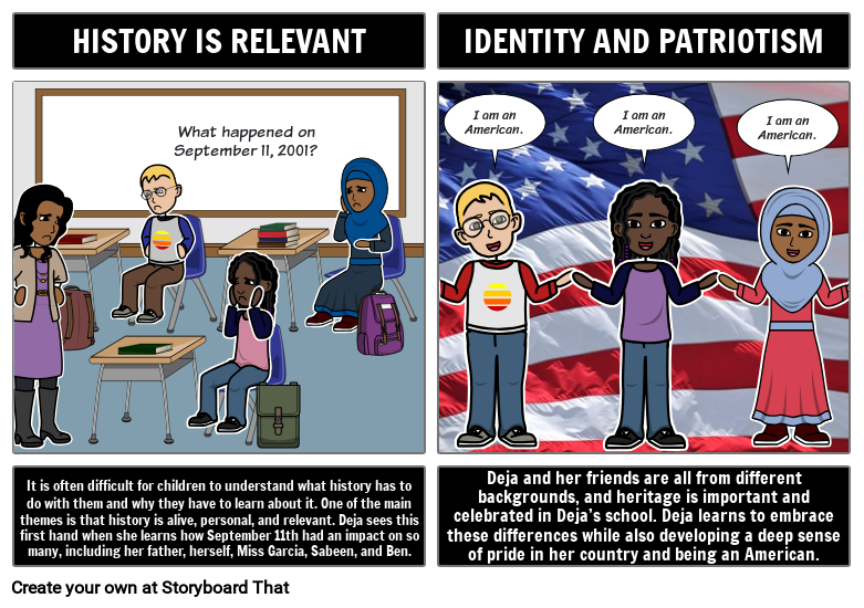 It is often difficult for children to understand what history has to do with them and why they have to learn about it. One of the main themes is that history is alive, personal, and relevant. Deja sees this first hand when she learns how September 11th had an impact on so many, including her father, herself, Miss Garcia, Sabeen, and Ben.