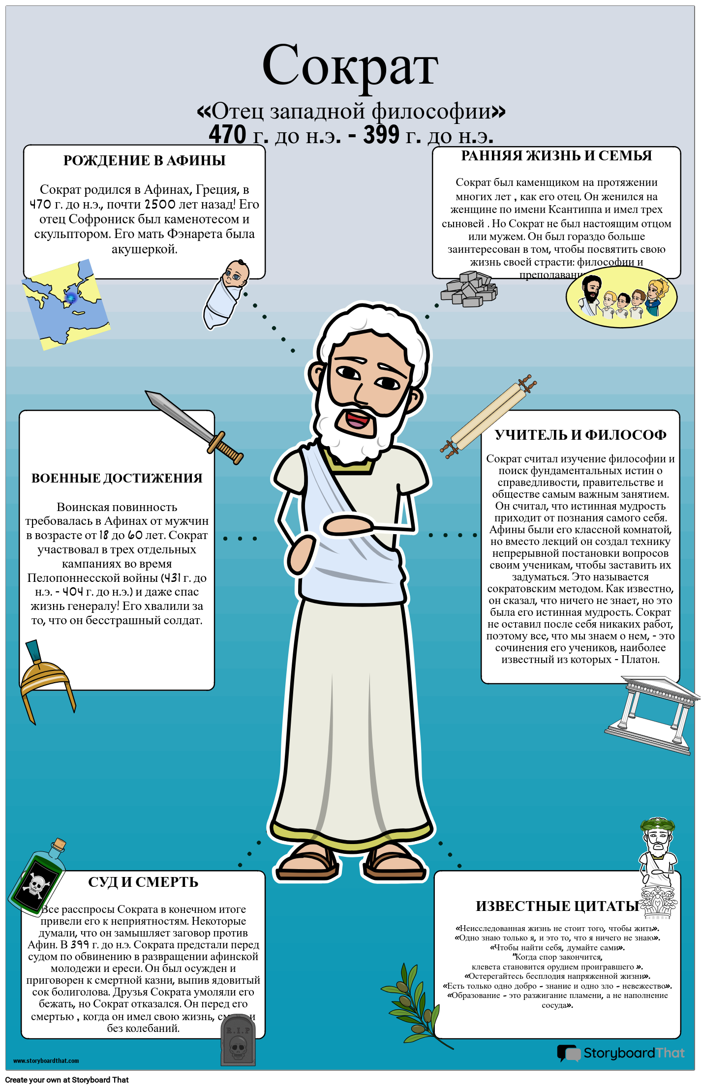 УЧИТЕЛЬ И ФИЛОСОФ Сократ считал изучение философии и поиск фундаментальных истин о справедливости, правительстве и обществе самым важным занятием. Он считал, что истинная мудрость приходит от познания самого себя. Афины были его классной комнатой, но вместо лекций он создал технику непрерывной постановки вопросов своим ученикам, чтобы заставить их задуматься. Это называется сократовским методом. Как известно, он сказал, что ничего не знает, но это была его истинная мудрость. Сократ не оставил после себя никаких работ, поэтому все, что мы знаем о нем, - это сочинения его учеников, наиболее известный из которых - Платон.