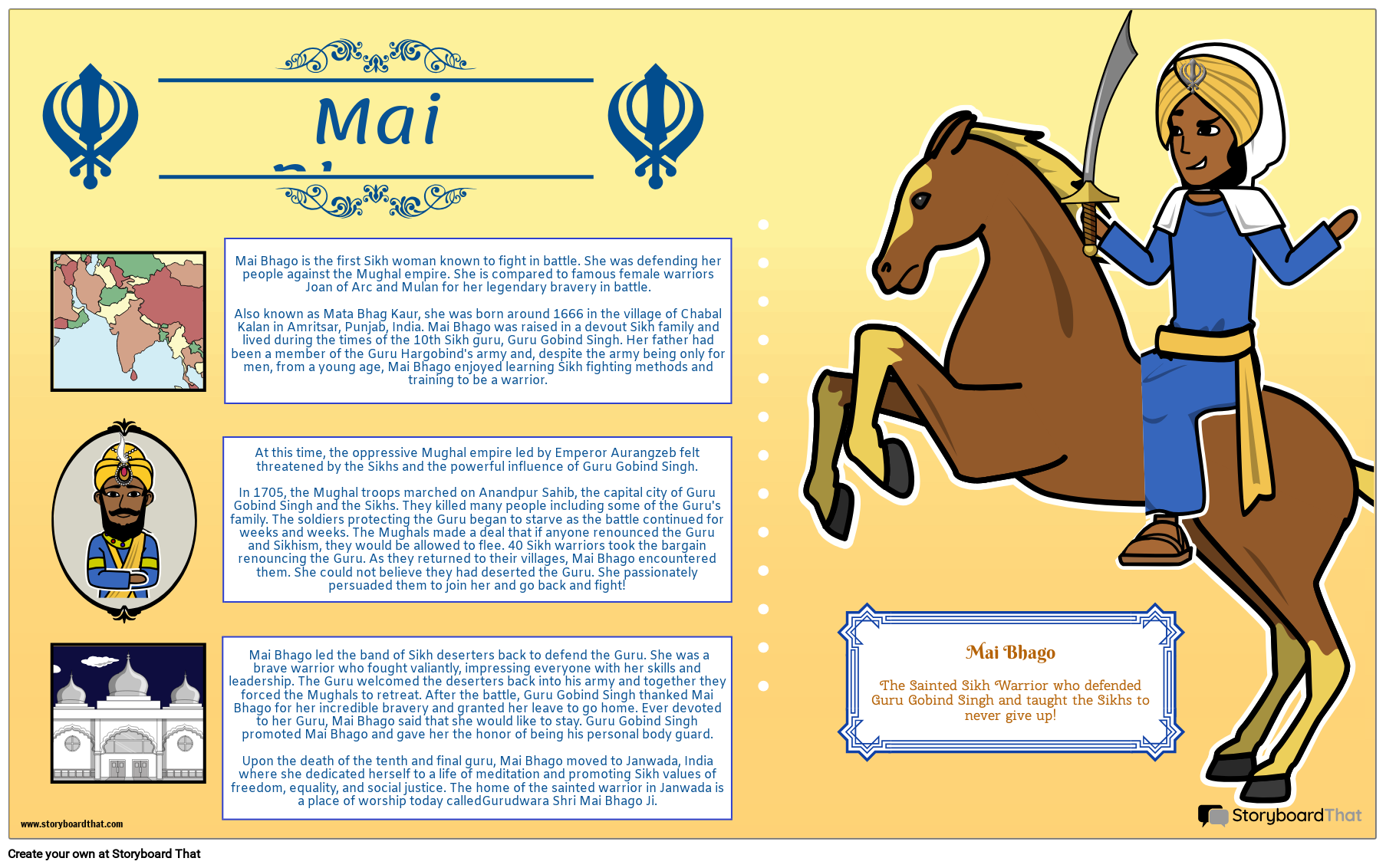 Mai Bhago is the first Sikh woman known to fight in battle. She was defending her people against the Mughal empire. She is compared to famous female warriors Joan of Arc and Mulan for her legendary bravery in battle.Also known as Mata Bhag Kaur, she was born around 1666 in the village of Chabal Kalan in Amritsar, Punjab, India. Mai Bhago was raised in a devout Sikh family and lived during the times of the 10th Sikh guru, Guru Gobind Singh. Her father had been a member of the Guru Hargobind's army and, despite the army being only for men, from a young age, Mai Bhago enjoyed learning Sikh fighting methods and training to be a warrior.
