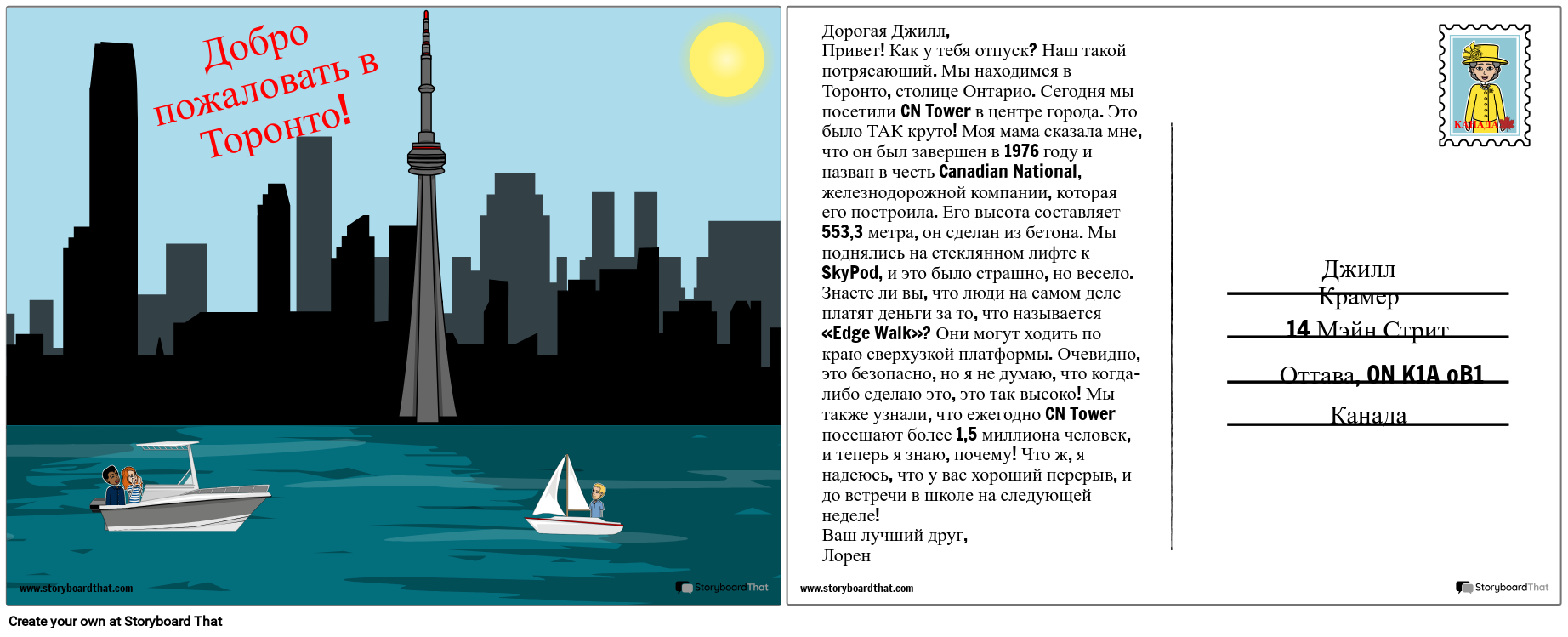 Дорогая Джилл, Привет! Как у тебя отпуск? Наш такой потрясающий. Мы находимся в Торонто, столице Онтарио. Сегодня мы посетили CN Tower в центре города. Это было ТАК круто! Моя мама сказала мне, что он был завершен в 1976 году и назван в честь Canadian National, железнодорожной компании, которая его построила. Его высота составляет 553,3 метра, он сделан из бетона. Мы поднялись на стеклянном лифте к SkyPod, и это было страшно, но весело. Знаете ли вы, что люди на самом деле платят деньги за то, что называется «Edge Walk»? Они могут ходить по краю сверхузкой платформы. Очевидно, это безопасно, но я не думаю, что когда-либо сделаю это, это так высоко! Мы также узнали, что ежегодно CN Tower посещают более 1,5 миллиона человек, и теперь я знаю, почему! Что ж, я надеюсь, что у вас хороший перерыв, и до встречи в школе на следующей неделе! Ваш лучший друг, Лорен