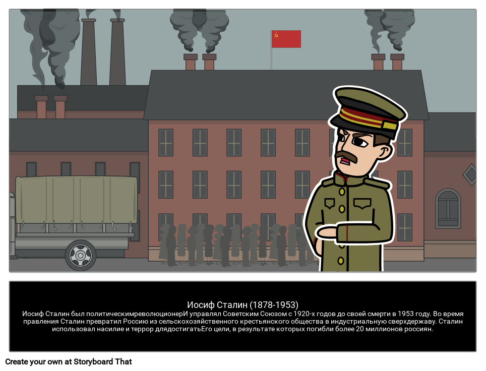 Иосиф Сталин (1878-1953)Иосиф Сталин был политическимреволюционерИ управлял Советским Союзом с 1920-х годов до своей смерти в 1953 году. Во время правления Сталин превратил Россию из сельскохозяйственного крестьянского общества в индустриальную сверхдержаву. Сталин использовал насилие и террор длядостигатьЕго цели, в результате которых погибли более 20 миллионов россиян.