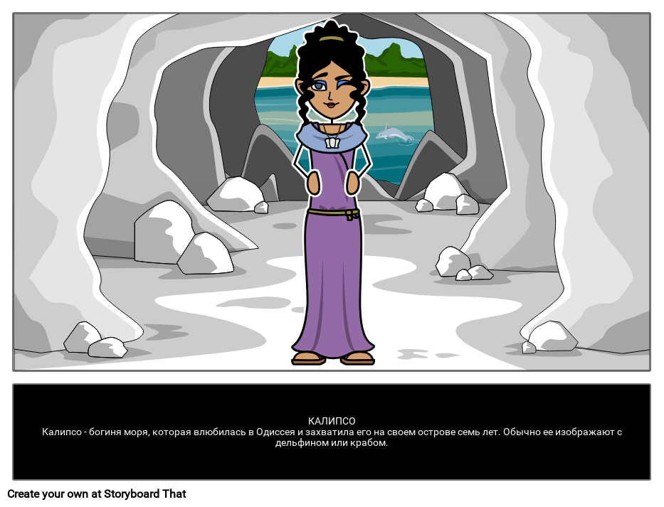 Калипсо - богиня моря, которая влюбилась в Одиссея и захватила его на своем острове семь лет. Обычно ее изображают с дельфином или крабом.