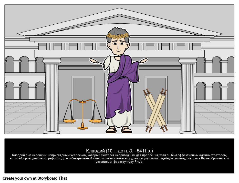 Клавдий | Клавдий был неловким, неприглядным человеком, который считался непригодным для правления, хотя он был эффективным администратором, который проводил много реформ. До его безвременной смерти руками жены ему удалось улучшить судебную систему, покорить Великобританию и укрепить инфраструктуру Рима.
