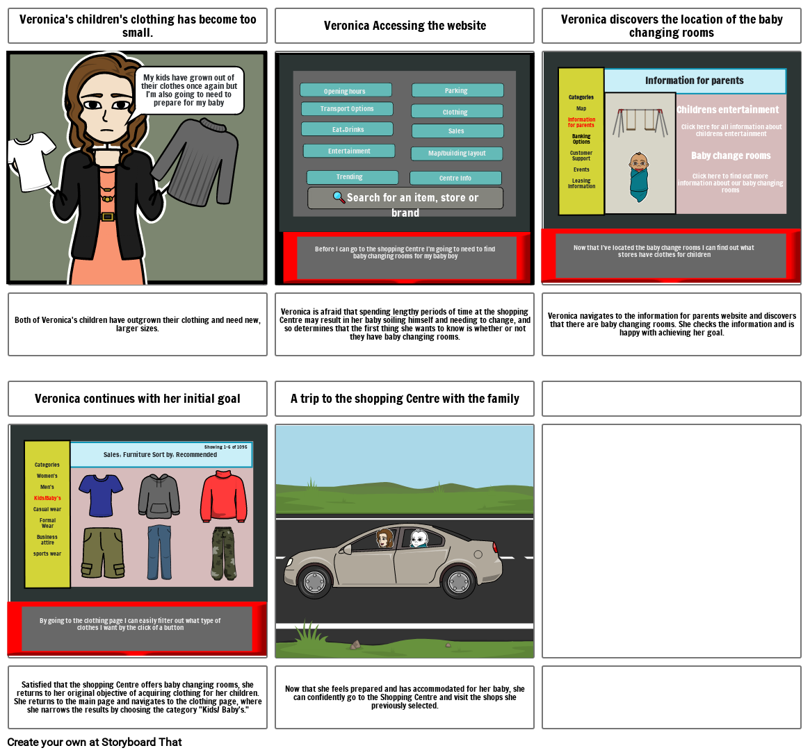 Veronica is afraid that spending lengthy periods of time at the shopping Centre may result in her baby soiling himself and needing to change, and so determines that the first thing she wants to know is whether or not they have baby changing rooms.