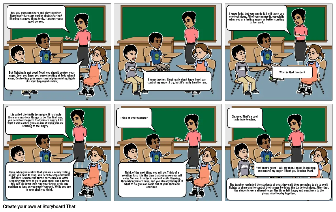 The teacher reminded the students of what they said they are going to do to avoid fights: to share and to control their anger by doing the turtle technique. After that, the students were allowed to go. The three left happy and went back to the playground to play together.