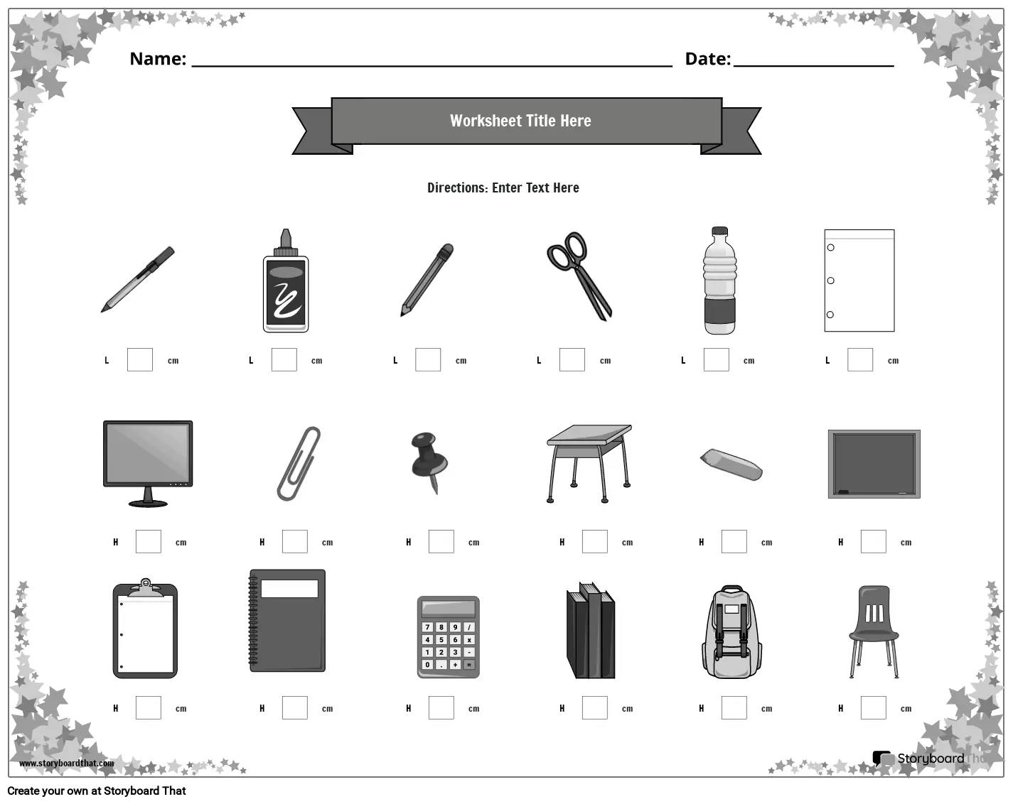 Metric measurement worksheet with classroom objects and star border (black