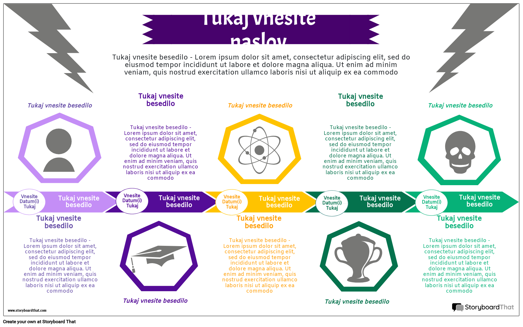 Ustvarite barvito in informativno zgodovinsko infografiko z uporabo te vodoravne oblike časovne osi s sedemkotniki in puščicami.