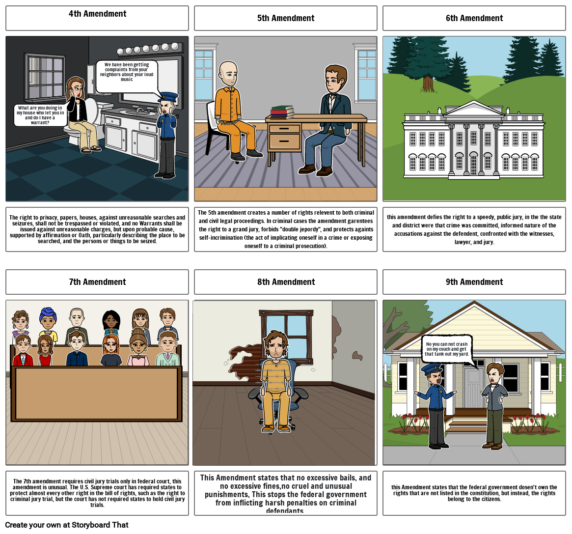 This Amendment states that no excessive bails, and no excessive fines,no cruel and unusual punishments, This stops the federal government from inflicting harsh penalties on criminal defendants.