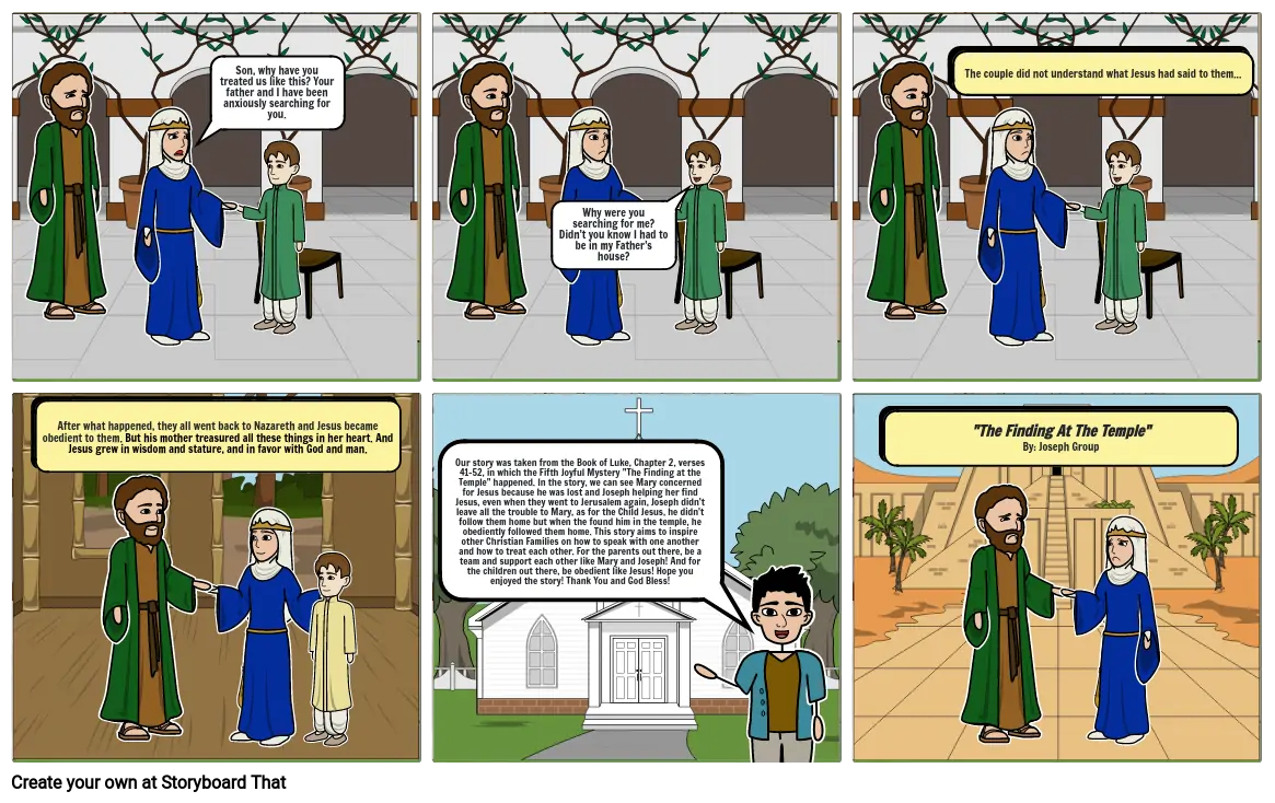 Our story was taken from the Book of Luke, Chapter 2, verses 41-52, in which the Fifth Joyful Mystery "The Finding at the Temple" happened. In the story, we can see Mary concerned for Jesus because he was lost and Joseph helping her find Jesus, even when they went to Jerusalem again, Joseph didn't leave all the trouble to Mary, as for the Child Jesus, he didn't follow them home but when the found him in the temple, he obediently followed them home. This story aims to inspire other Christian Families on how to speak with one another and how to treat each other. For the parents out there, be a team and support each other like Mary and Joseph! And for the children out there, be obedient like Jesus! Hope you enjoyed the story! Thank You and God Bless!