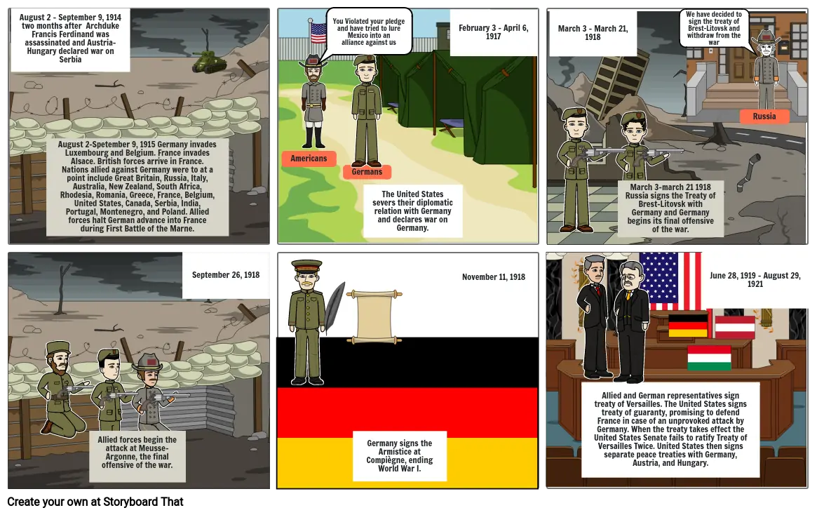 August 2-Spetember 9, 1915 Germany invades Luxembourg and Belgium. France invades Alsace. British forces arrive in France. Nations allied against Germany were to at a point include Great Britain, Russia, Italy, Australia, New Zealand, South Africa, Rhodesia, Romania, Greece, France, Belgium, United States, Canada, Serbia, India, Portugal, Montenegro, and Poland. Allied forces halt German advance into France during First Battle of the Marne.