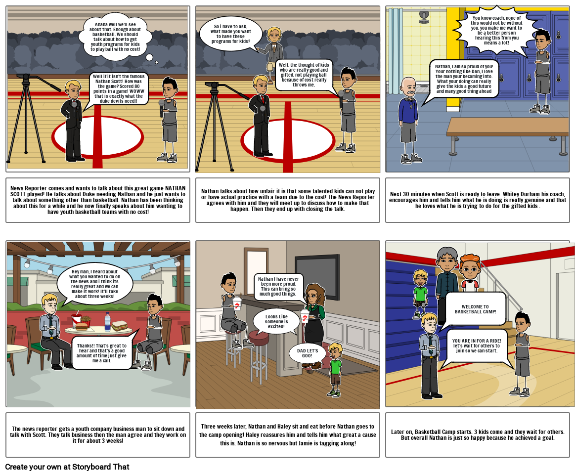 News Reporter comes and wants to talk about this great game NATHAN SCOTT played! He talks about Duke needing Nathan and he just wants to talk about something other than basketball. Nathan has been thinking about this for a while and he now finally speaks about him wanting to have youth basketball teams with no cost!