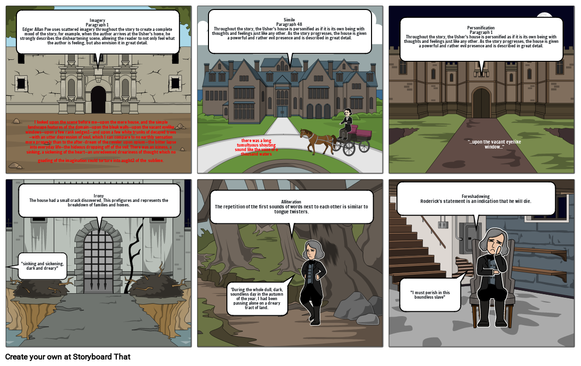 SimileParagraph 48Throughout the story, the Usher's house is personified as if it is its own being with thoughts and feelings just like any other. As the story progresses, the house is given a powerful and rather evil presence and is described in great detail.