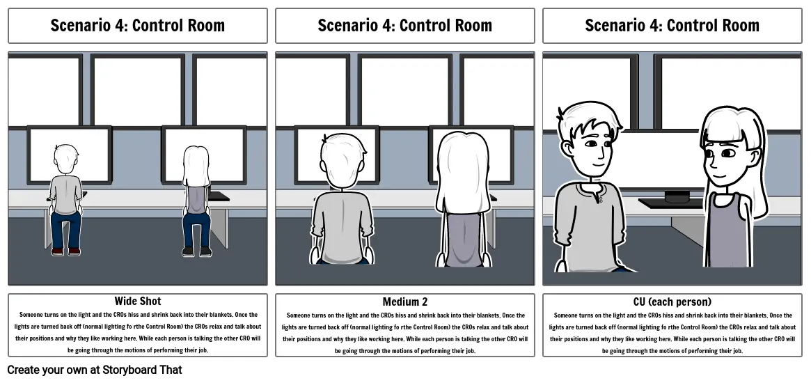 Medium 2 Someone turns on the light and the CROs hiss and shrink back into their blankets. Once the lights are turned back off (normal lighting fo rthe Control Room) the CROs relax and talk about their positions and why they like working here. While each person is talking the other CRO will be going through the motions of performing their job.