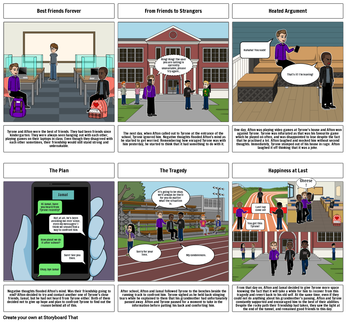 Tyrone and Afton were the best of friends. They had been friends since kindergarten. They were always seen hanging out with each other, playing games on their laptops in class. Even though they disagreed with each other sometimes, their friendship would still stand strong and unbreakable.