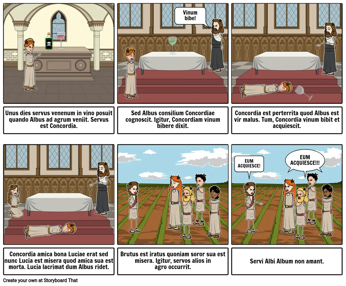 Unus dies servus venenum in vino posuit quando Albus ad agrum veniit. Servus est Concordia.