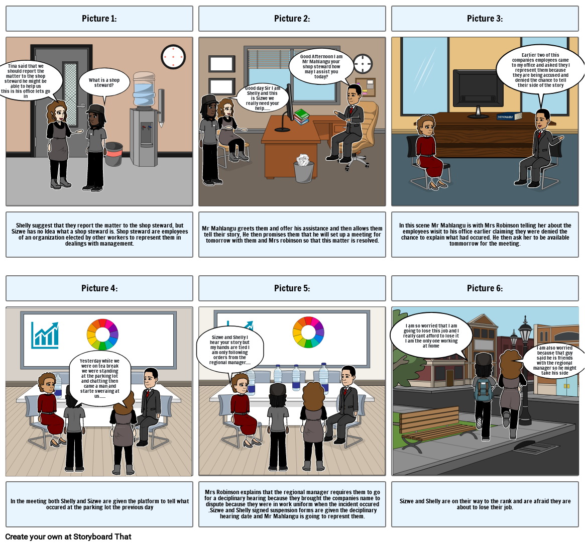 Mrs Robinson explains that the regional manager requires them to go for a deciplinary hearing because they brought the companies name to dispute because they were in work uniform when the incident occured .Sizwe and Shelly signed suspension forms are given the deciplinary hearing date and Mr Mahlangu is going to represnt them.