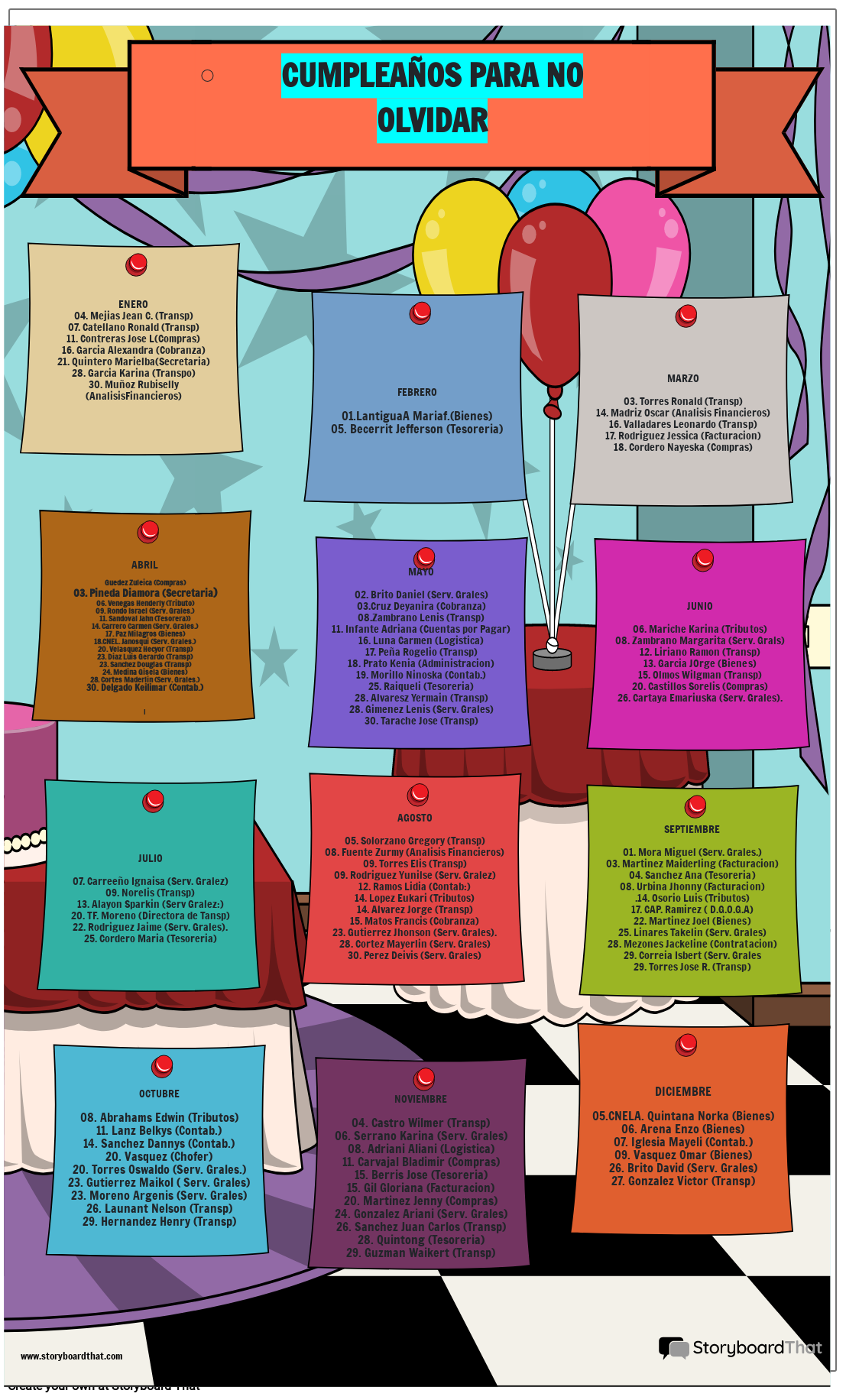 NOVIEMBRE04. Castro Wilmer (Transp)06. Serrano Karina (Serv. Grales)08. Adriani Aliani (Logistica)11. Carvajal Bladimir (Compras)15. Berris Jose (Tesoreria)15. Gil Gloriana (Facturacion)20. Martinez Jenny (Compras)24. Gonzalez Ariani (Serv. Grales)26. Sanchez Juan Carlos (Transp)28. Quintong (Tesoreria)29. Guzman Waikert (Transp)