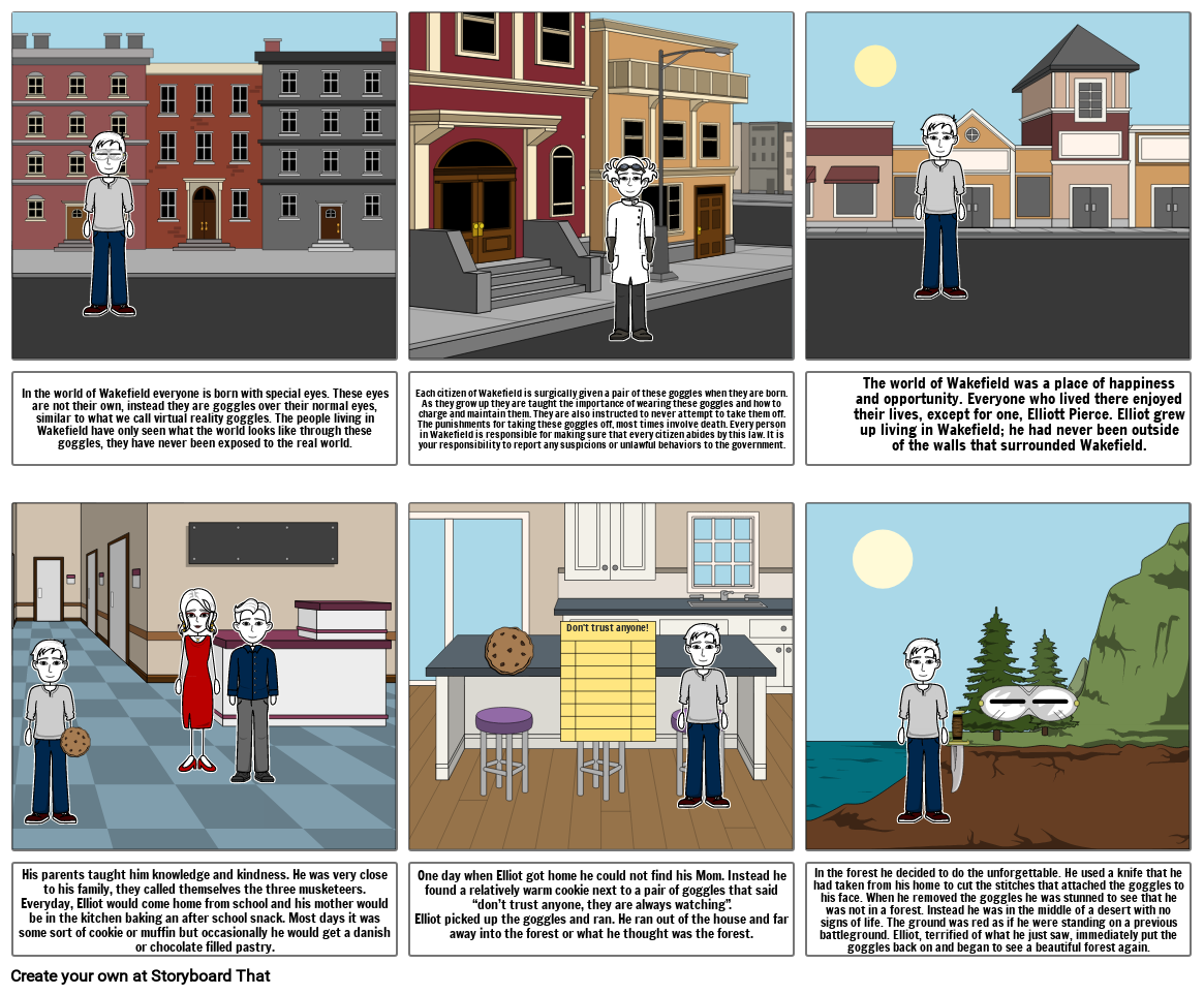 In the world of Wakefield everyone is born with special eyes. These eyes are not their own, instead they are goggles over their normal eyes, similar to what we call virtual reality goggles. The people living in Wakefield have only seen what the world looks like through these goggles, they have never been exposed to the real world.