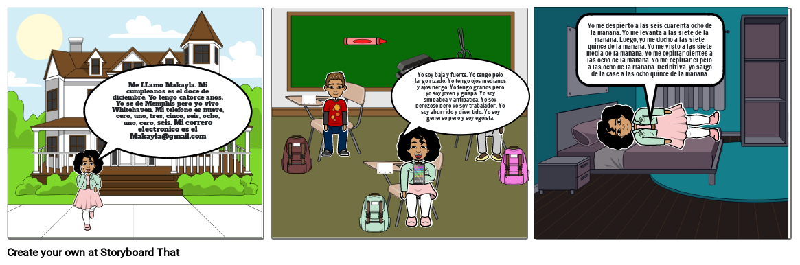 Me LLamo Makayla. Mi cumpleanos es el doce de diciembre. Yo tengo catorce anos. Yo se de Memphis pero yo vivo Whitehaven. Mi telefono es nueve, cero, uno, tres, cinco, seis, ocho, uno, cero, seis. Mi correro electronico es el Makayla@gmail.com