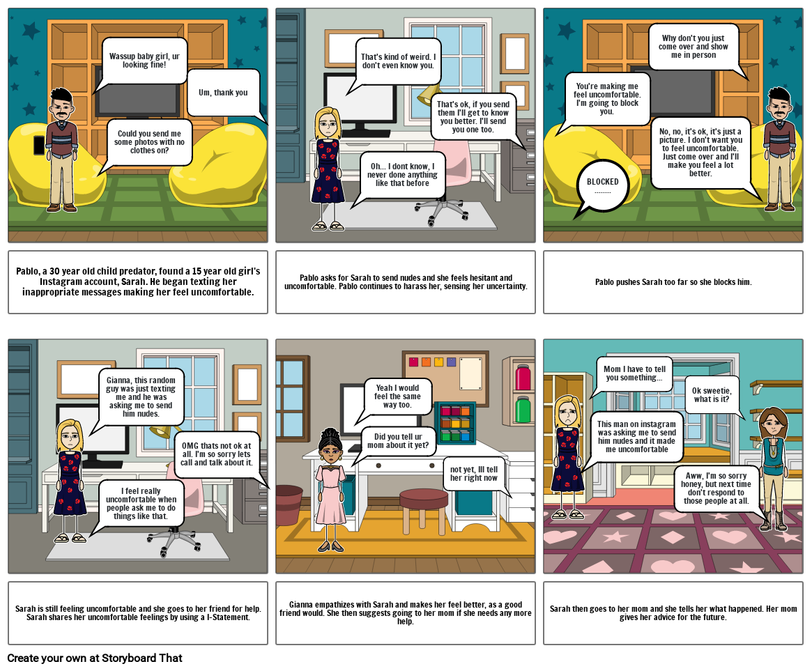 Pablo, a 30 year old child predator, found a 15 year old girl's Instagram account, Sarah. He began texting her inappropriate messages making her feel uncomfortable.