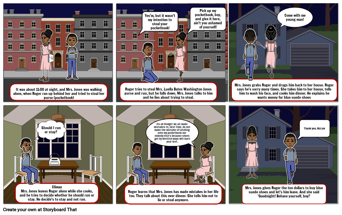 ClimaxMrs. Jones leaves Roger alone while she cooks, and he tries to decide whether he should run or stay. He decide's to stay and not run.
