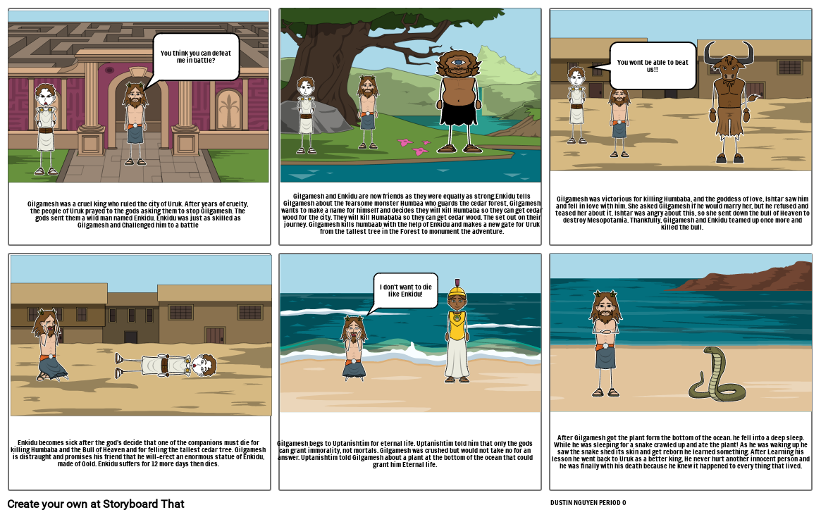 Gilgamesh was a cruel king who ruled the city of Uruk. After years of cruelty, the people of Uruk prayed to the gods asking them to stop Gilgamesh. The gods sent them a wild man named Enkidu. Enkidu was just as skilled as Gilgamesh and Challenged him to a battle
