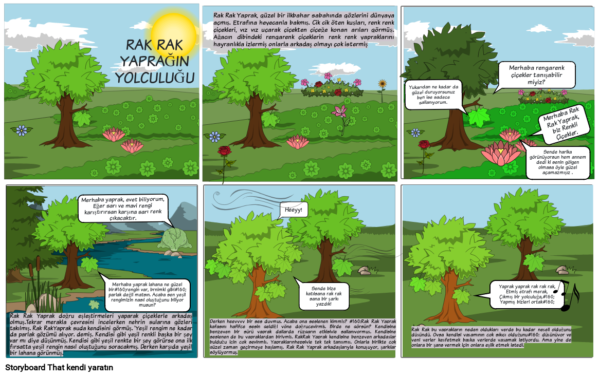 Rak Rak Yaprak, güzel bir ilkbahar sabahında gözlerini dünyaya açmış. Etrafına heyecanla bakmış. Cik cik öten kuşları, renk renk çiçekleri, vız vız uçarak çiçekten çiçeğe konan arıları görmüş. Ağacın dibindeki rengarenk çiçeklerin renk renk yapraklarını hayranlıkla izlermiş onlarla arkadaş olmayı çok istermiş