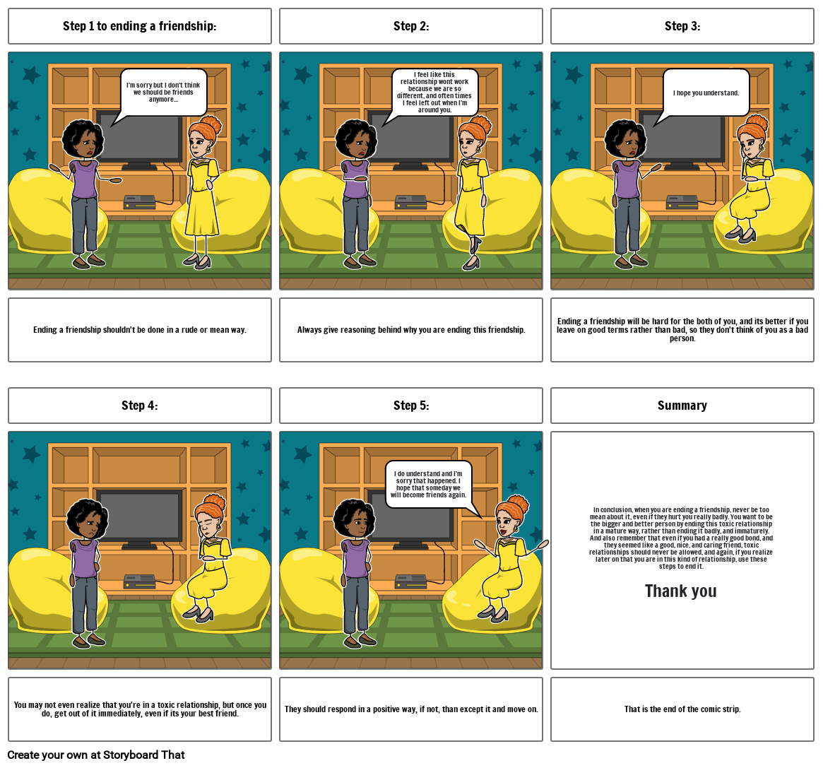 In conclusion, when you are ending a friendship, never be too mean about it, even if they hurt you really badly. You want to be the bigger and better person by ending this toxic relationship in a mature way, rather than ending it badly, and immaturely. And also remember that even if you had a really good bond, and they seemed like a good, nice, and caring friend, toxic relationships should never be allowed, and again, if you realize later on that you are in this kind of relationship, use these steps to end it. Thank you