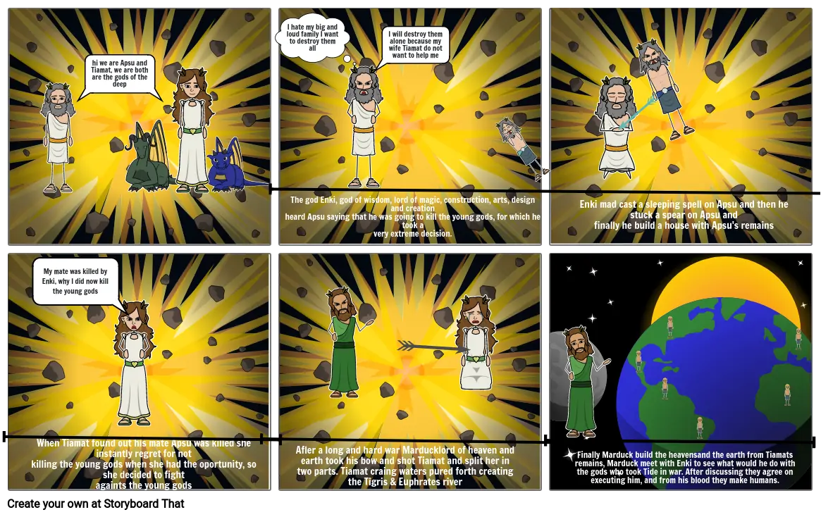 Finally Marduck build the heavensand the earth from Tiamats remains, Marduck meet with Enki to see what would he do with the gods who took Tide in war. After discussing they agree on executing him, and from his blood they make humans.