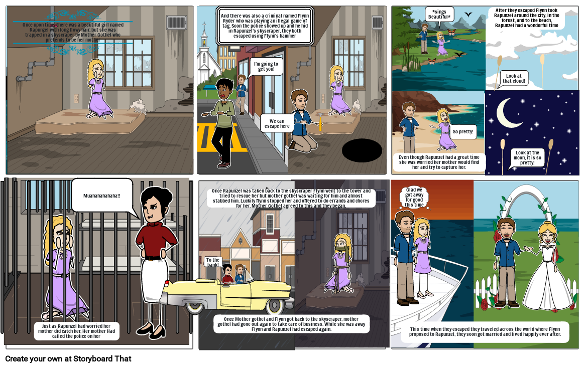 Once upon time, there was a beautiful girl named Rapunzel with long flowy hair, but she was trapped in a skyscraper by Mother Gothel who pretends to be her mother